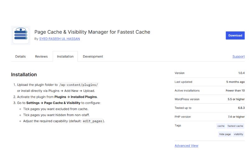 A lightweight tool allowing administrators to control page caching and visibility settings when using the WP Fastest Cache plugin.